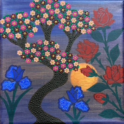 Dans cette toile de 20 x 20 cm, un arbre en fleurs s’incline doucement sous le ciel du soir. Les roses, les iris et les petites fleurs se détachent sur un fond crépusculaire baigné d’une lumière dorée, comme un souffle suspendu.