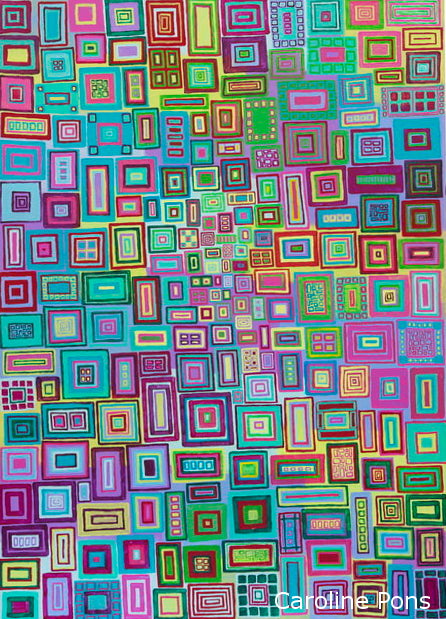 Les tons fuchsia, turquoise, émeraude, lilas et or s’enchevêtrent dans un ordre mouvant, hypnotique, presque musical. C’est une ville intérieure qu’on survole ici, une cartographie émotionnelle où l’œil plane sans jamais se heurter, guidé par un vent doux et une douce curiosité.
