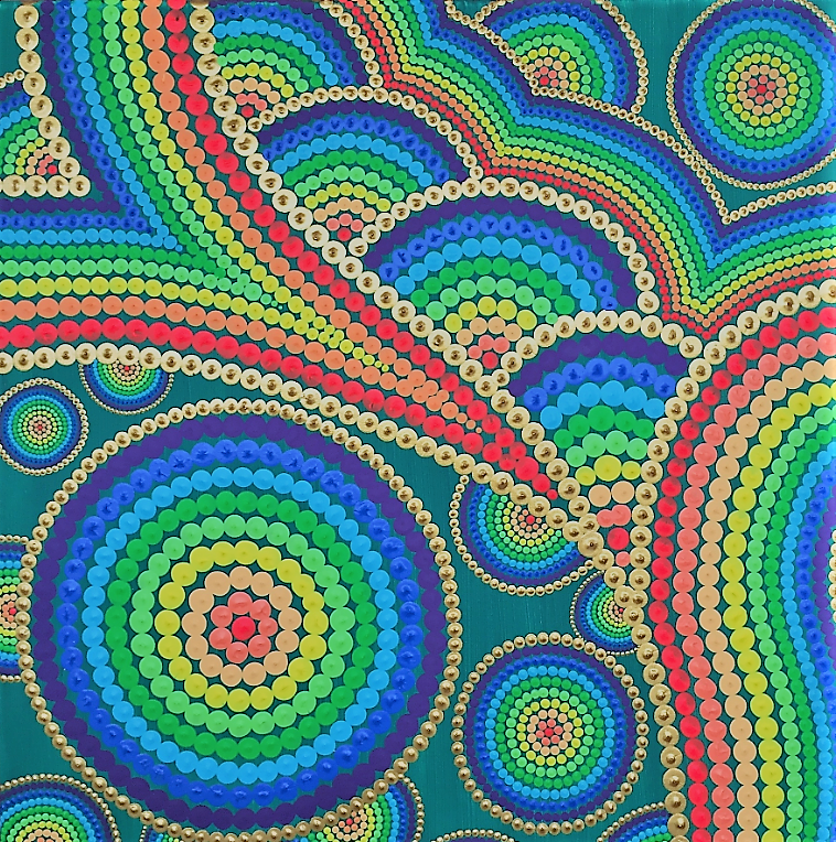 Un souffle chaud traverse la toile, vibrant d’un vert profond et d’un éclat de feu. Dans cette jungle onirique, les cercles colorés se déploient comme des feuillages en spirales, des lianes de lumière, des fruits de songes. Chaque teinte est une pulsation, chaque motif une vibration de la canopée. Le regard s’y perd, comme happé dans les murmures d’une forêt vivante, luxuriante et festive.