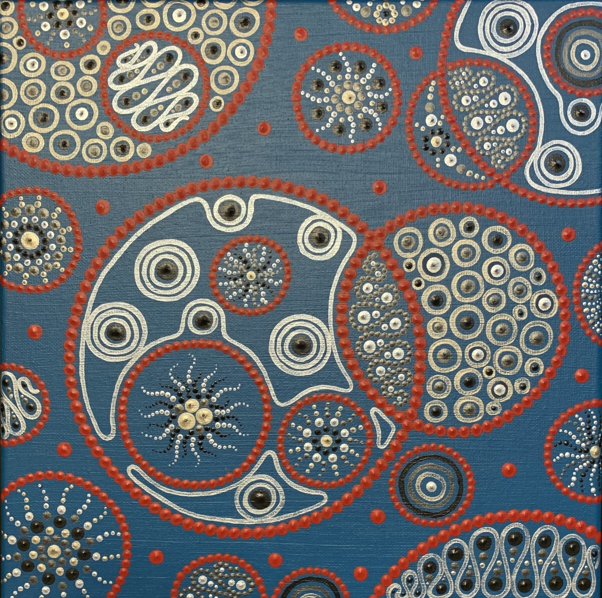 Dans cette toile de 30 x 30 cm, les formes se répondent dans une harmonie organique, entre cellule et étoile, entre science et rêve.