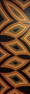 Dans un rythme régulier et hypnotique, « La danse des formes » fait naître un mouvement continu, presque organique. Les losanges s’enchaînent, se superposent et se répondent, tels des pas chorégraphiques inscrits dans l’espace. Les teintes de cuivre, d’ocre et d’orange viennent vibrer sur le noir profond, créant un contraste lumineux qui évoque autant la chaleur d’un feu que le battement d’un souffle intérieur.