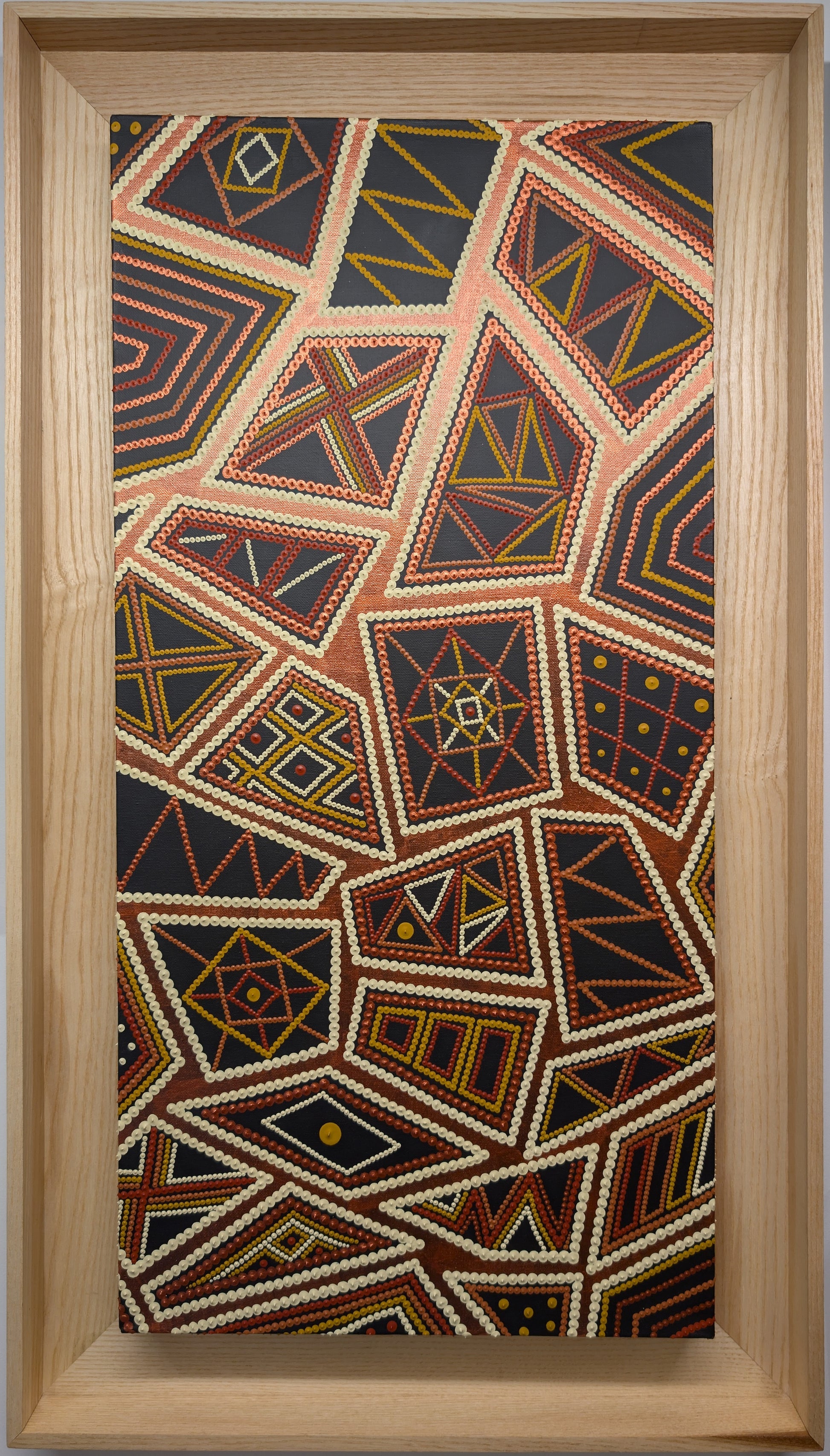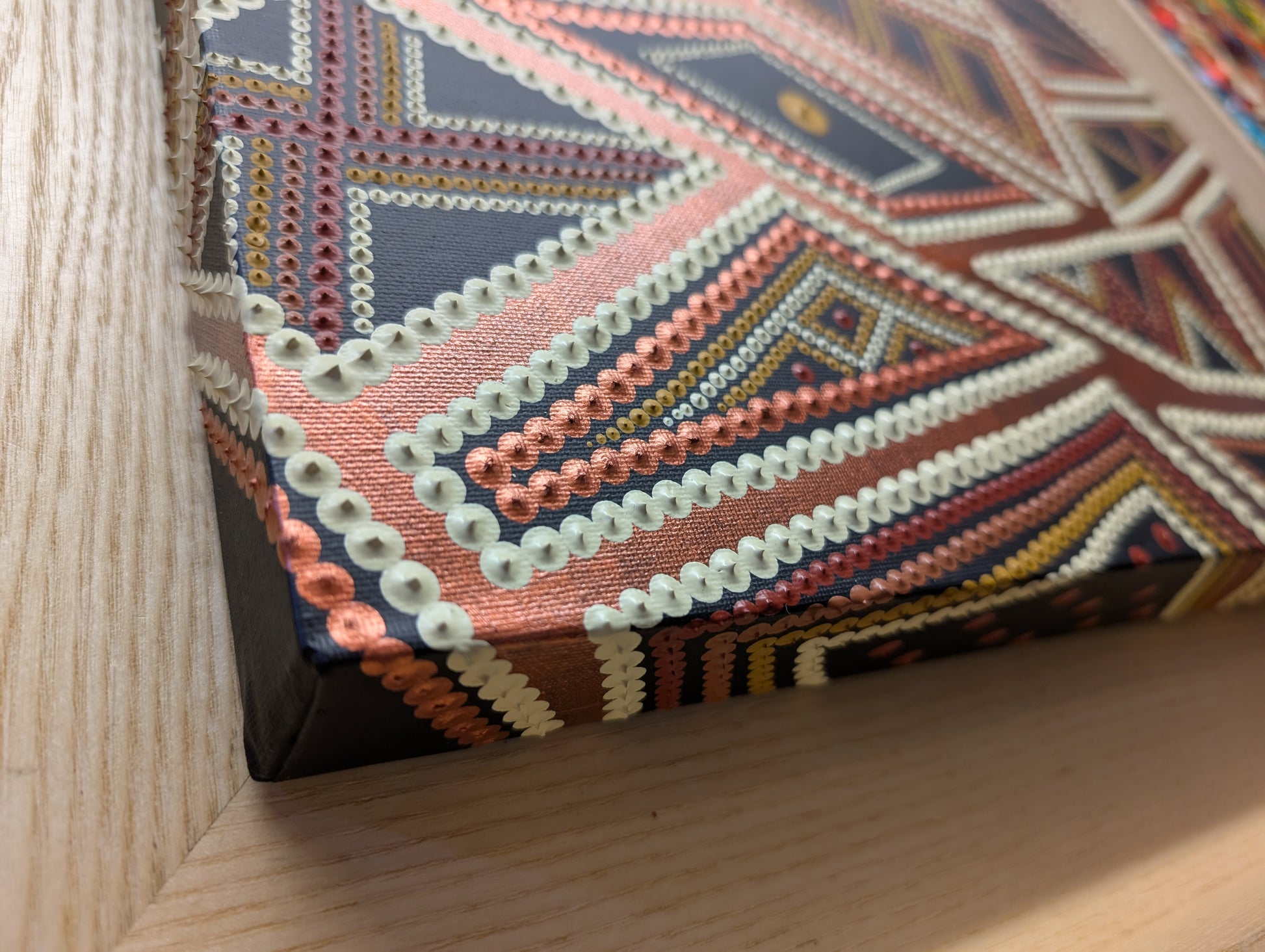 Chaque point, minutieusement posé, devient un battement, une empreinte. Le rouge brûle doucement, l’ocre résonne, le blanc éclaire. C’est une carte intérieure, un territoire sacré dont les chemins se répètent sans jamais se confondre.