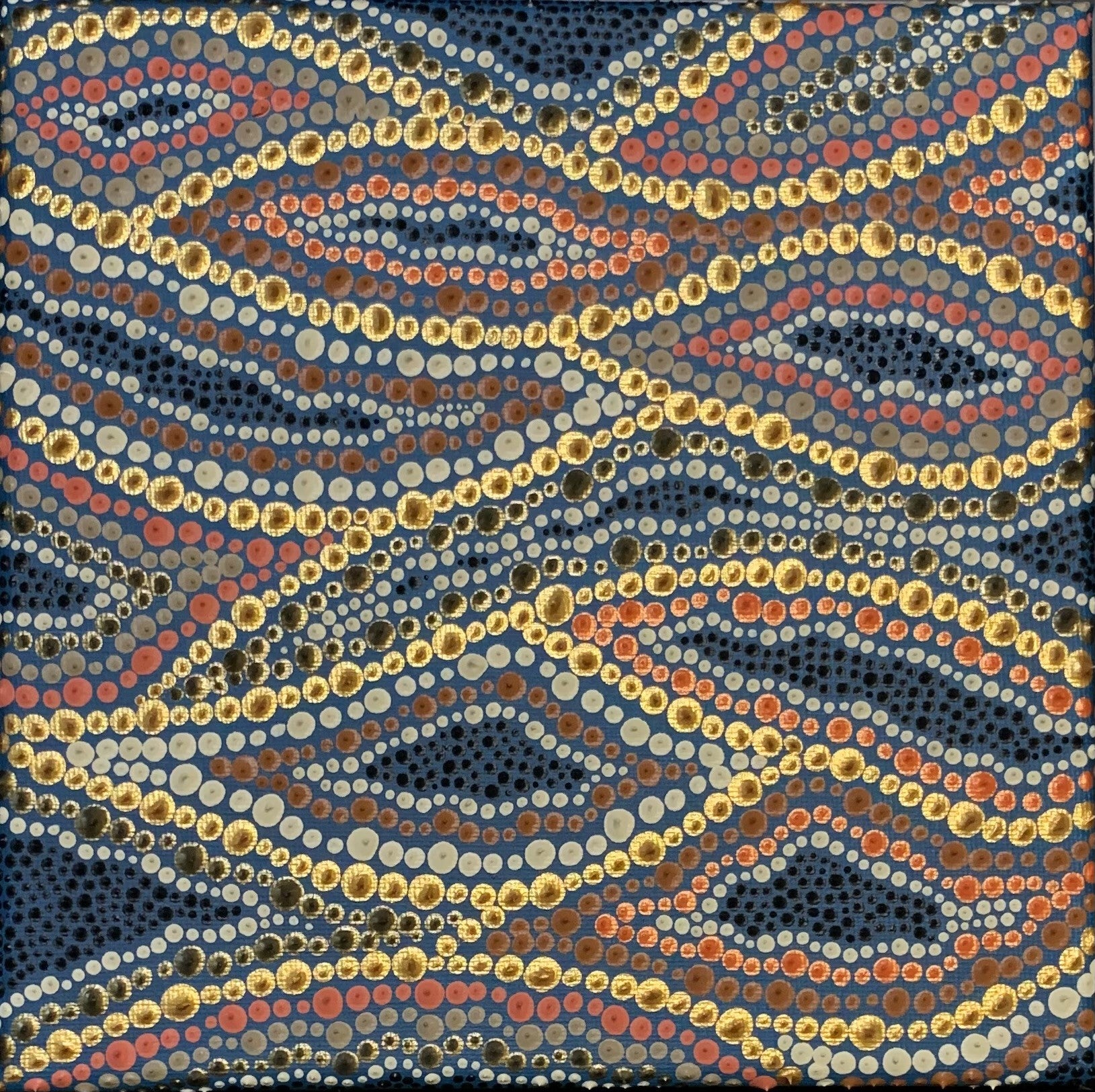 Des lignes dorées traversent la toile comme des chants anciens dans la nuit. Les points, posés un à un, dessinent des courants souterrains, lumineux, secrets.