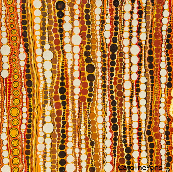 Dans cette toile de 80 x 80 cm, chaque point est un souffle, un fragment de chaleur, un pas sur une terre ancienne. L’œil s’y perd comme dans le sable qui glisse entre les doigts, hypnotisé par les rythmes, les nuances, les silences dorés.