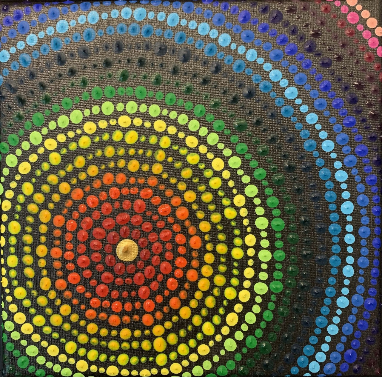 Depuis un cœur doré, les couleurs s’élancent en cercles vivants, comme une onde silencieuse qui traverse le noir. Rouge, orange, vert, bleu, violet… chaque nuance pulse avec régularité, comme si le spectre de la lumière devenait rythme, souffle, vibration.