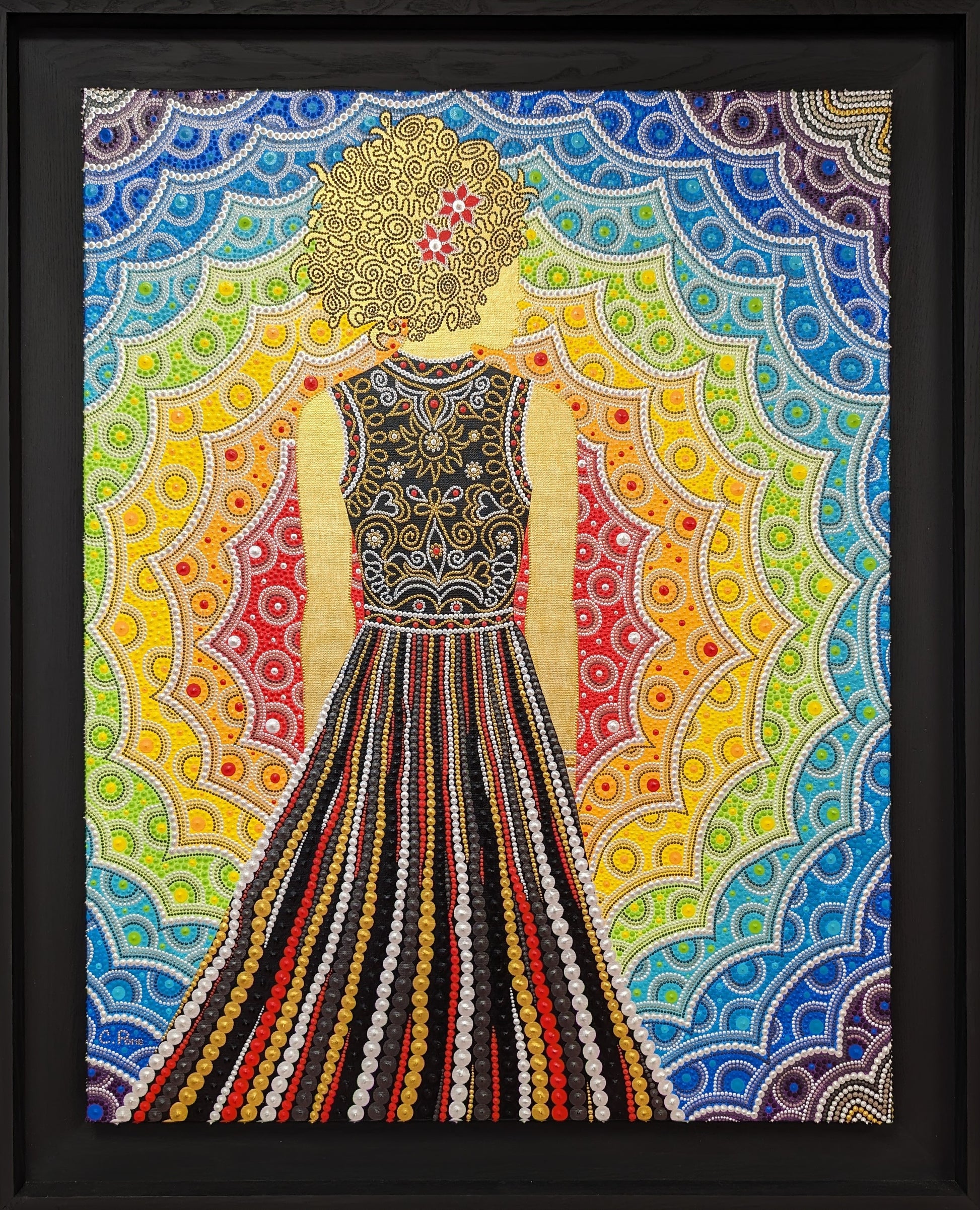 Son corps, baigné d’un fond doré, semble ne faire qu’un avec la toile, tandis que l’aura vibrante qui l’entoure déploie des ondes de paix en éventail. Le motif, en dentelle de points, danse autour d’elle dans un arc-en-ciel apaisé, tel un souffle de vie qui respire lentement, doucement.