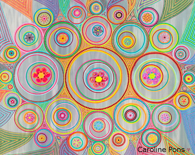 Sur un fond argenté comme un ciel d’orage apaisé, elles dansent leur fête en silence, traçant des cercles, des spirales, des mandalas éclatants. Chaque toupie semble une planète en liesse, un cœur tournoyant, une fleur en mouvement.
