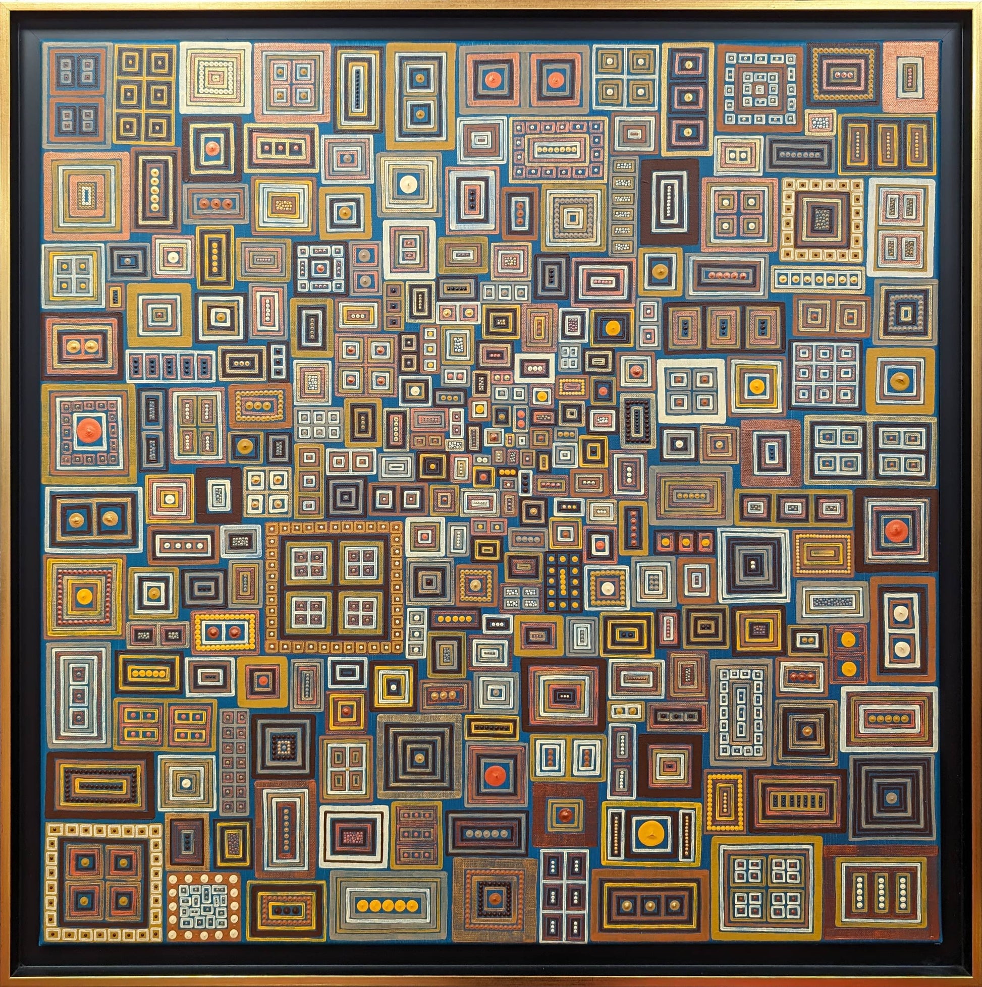 À la manière d’une cité née du silence et de la répétition, l’œuvre foisonne de motifs presque rituels, où l’infiniment petit dialogue avec l’immense. On y devine des ruelles invisibles, des places cachées, des structures mathématiques que seule la poésie peut habiter. Le regard s’y perd… puis s’y retrouve, guidé par les pulsations chromatiques — éclats d’ocre, de bleu dense, de rouge solaire ou d’or vieilli — qui font vibrer cette architecture mentale.