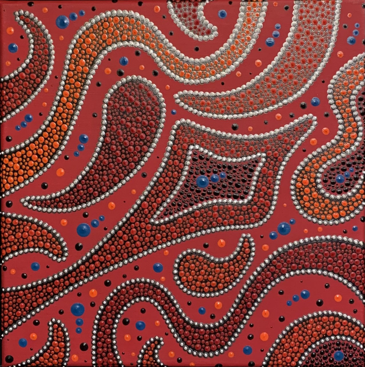 Dans cette toile de 30 x 30 cm, les formes serpentent comme des bribes de feu, des élans retenus dans le souffle d’un geste. Les rouges profonds, les pointillés argentés, les éclats bleus et orangés tracent un chemin vibrant, organique, presque dansant.